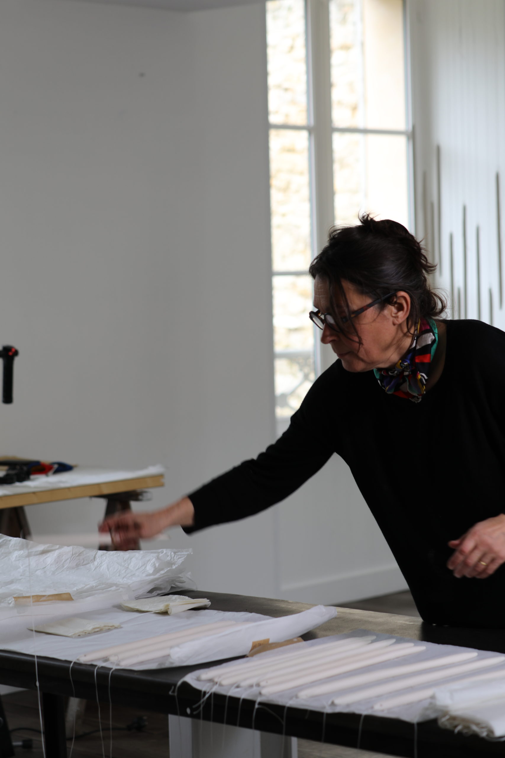 Une installation complexe aussi physiquement pour l’artiste, dès la production. Chaque aiguille est façonnée par le geste de l’artiste. Ensuite, l’artiste installe chaque aiguille sur les rails grâce aux fils suifés, les aiguilles offrent une tension naturelle aux fils, qui donnent alors une profondeur surprenante à l’œuvre. Le geste d’accrochage est répétitif, en équilibre sur un escabeau.