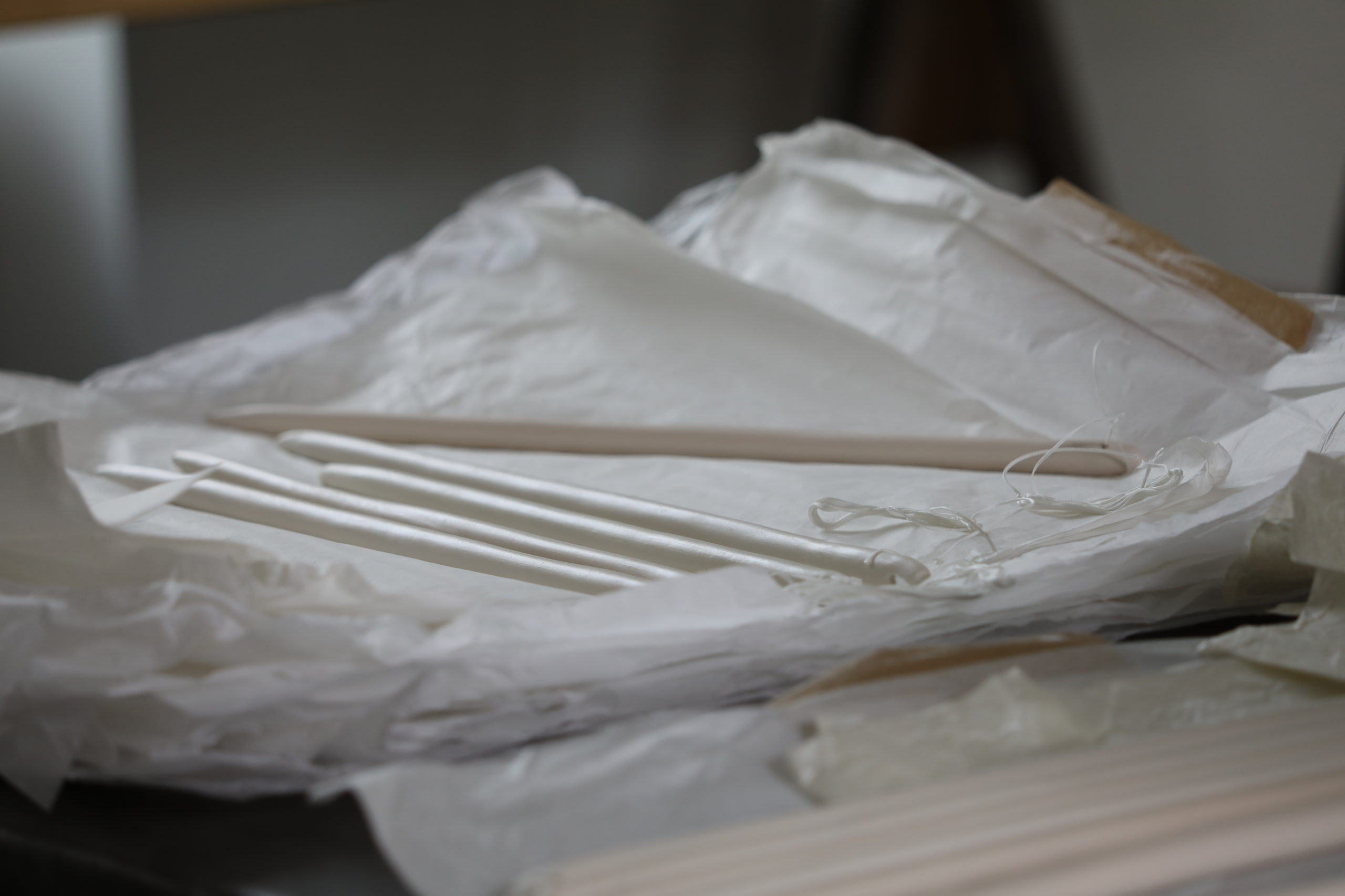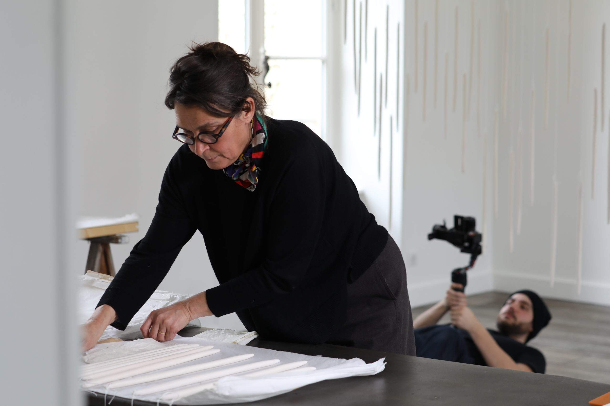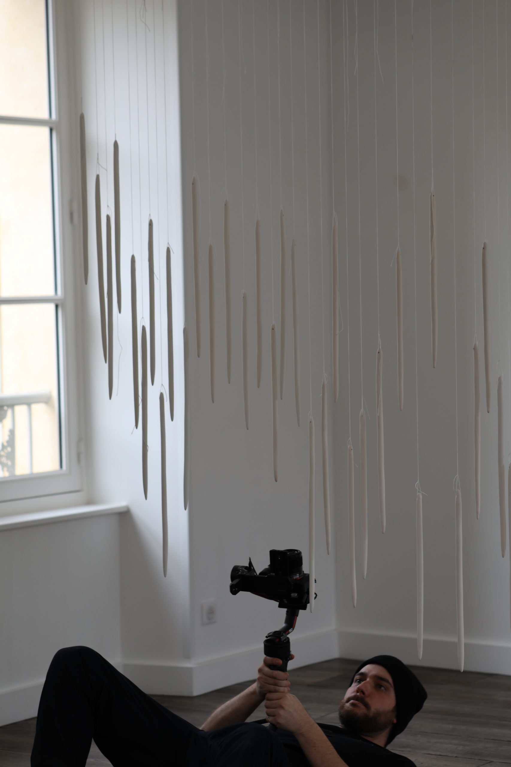 Virga, c’est plus de 400 aiguilles en céramique, toutes créées une à une par les mains de Cat Loray, qui s’est spécialisée dans la céramique depuis de nombreuses années. Elle emploie d’ailleurs une technique particulière, rare, avec une terre fragile et complexe à manipuler et à cuire.